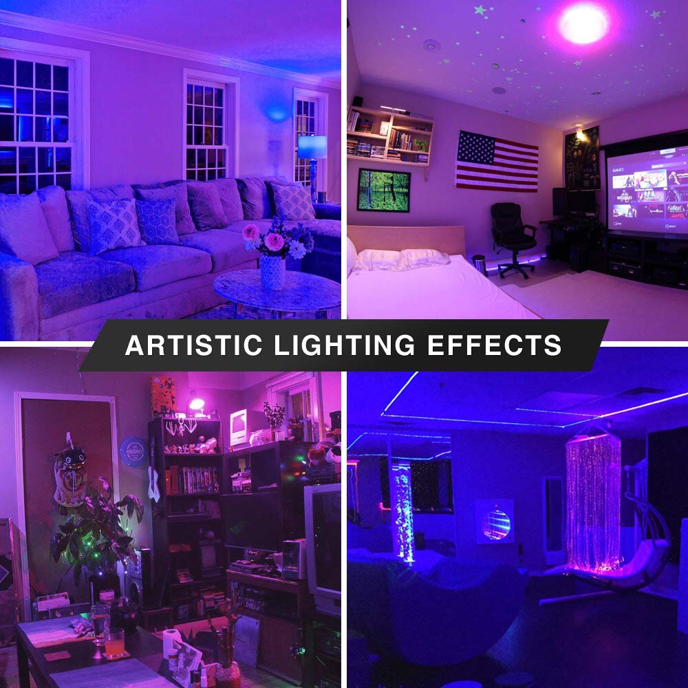 Blacklight Bulbs: Rays from ultraviolet Blacklight Bulbs cast a beautiful glow when directed at certain colored objects, making them perfect for decorative and artistic lighting effects to create a visually dramatic atmosphere.