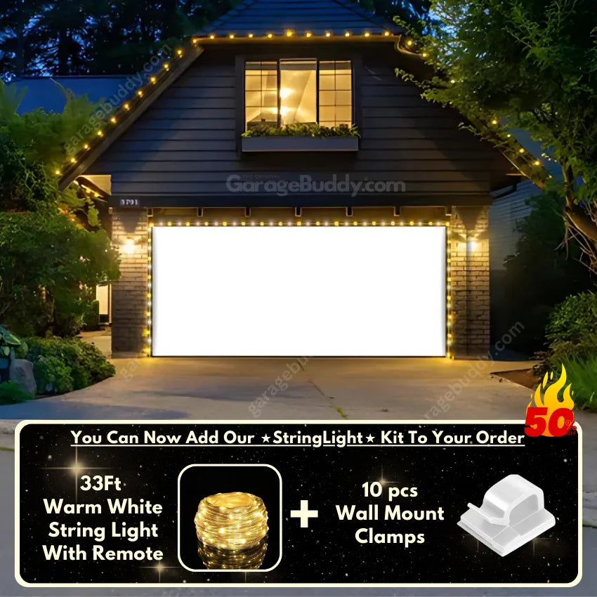 You now have an option to add the GarageBuddy string light kit to your order at 50% off and turn your garage into a true winter wonderland. The kit includes 1x 33 ft warm white string light, a remote control and 10x sticky wall mount clamps. The 2-door garage option comes with 2 string light kits. The lights work on three AA batteries (not included), so you don't need to run around finding electrical outlets.