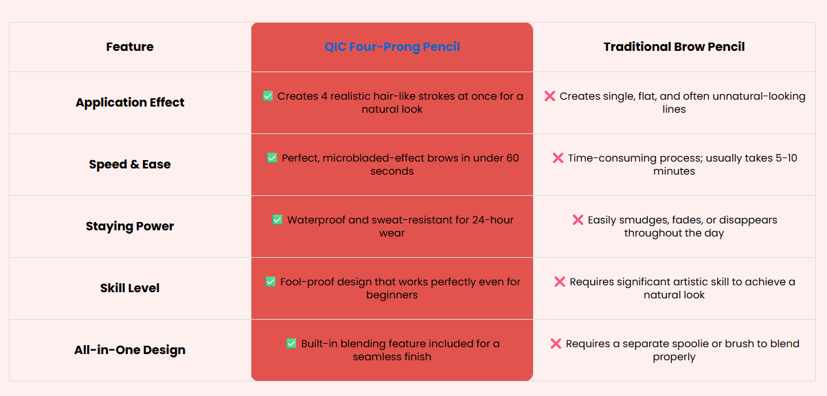 Professional microblading can be an expensive investmentthat involves needles and skin irritation. The QIC Four-ProngEyebrow Pencil delivers the same precise, feathery lookwithout the pain, long-term commitment, or the high cost of asalon appointment.